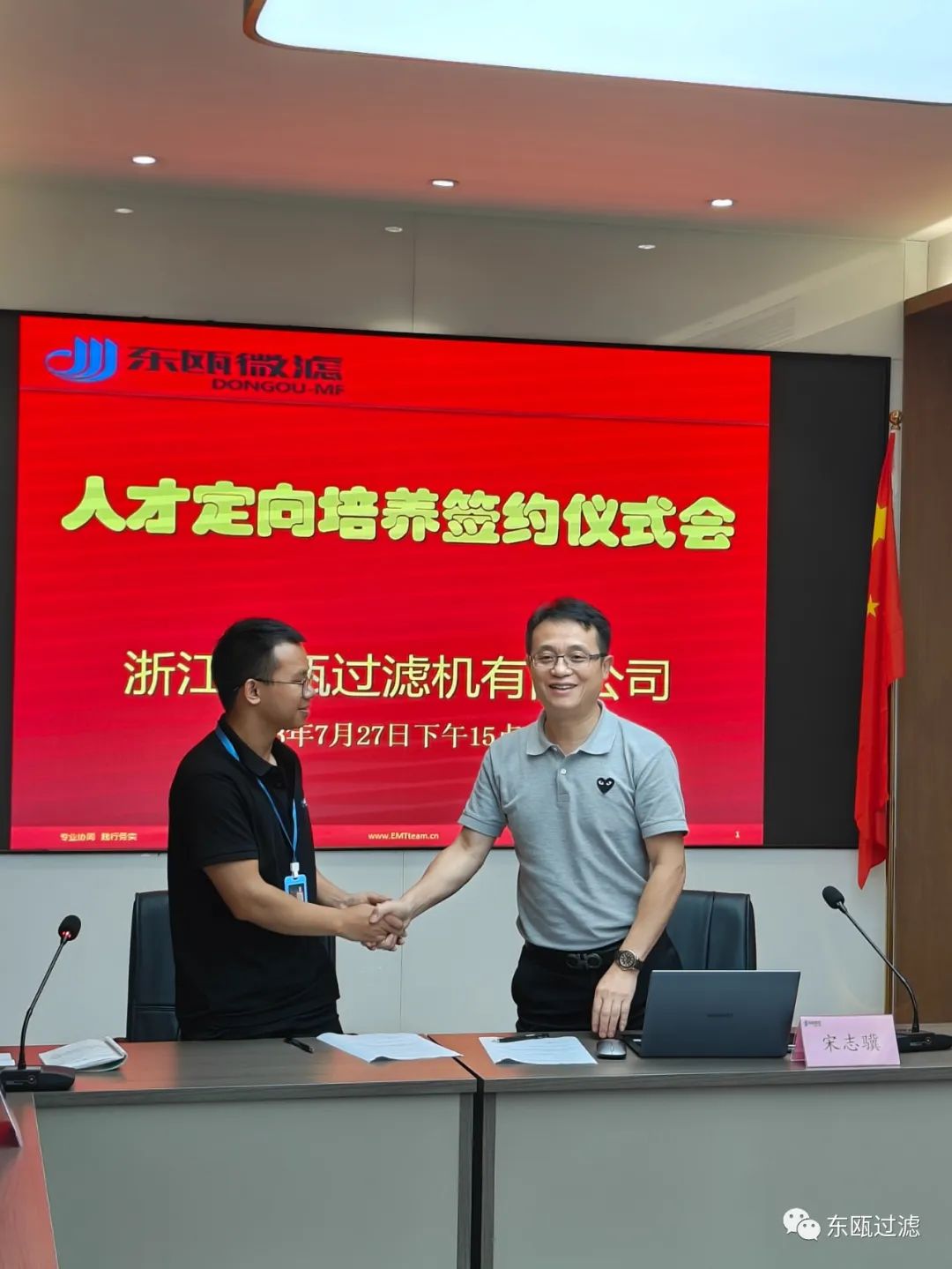 接着进行了颁奖和签约仪式。按照公司定向培养政策的规定,给予积极履行协议内容并较好的完成了本职工作的技术员陈先义同志颁发定向培养奖金。接着五位青年优秀员工与公司总经理宋志骥共同签署合作协议书,双方将通过制定具体计划、明确目标任务等方式,在今后长达数年时间内开展深度合作,在各自领域取得更多突破性进展。